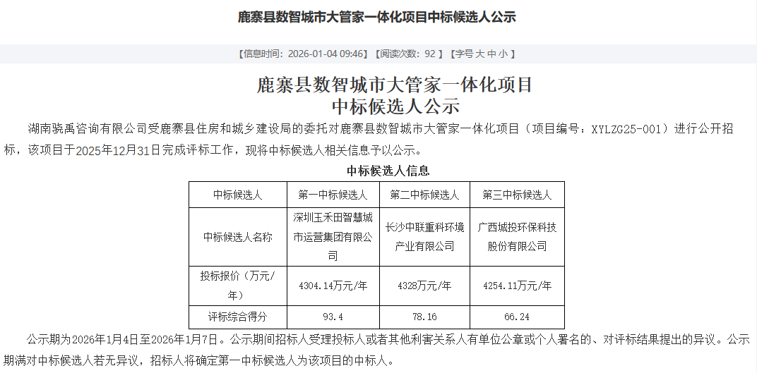 2026年1月4日,广西鹿寨县数智都邑大管家一体化项目中标候选人公示。玉禾田预中标,报价4304.14万元/年,该项目25年特许谋划期总效劳费可达10.76亿元。